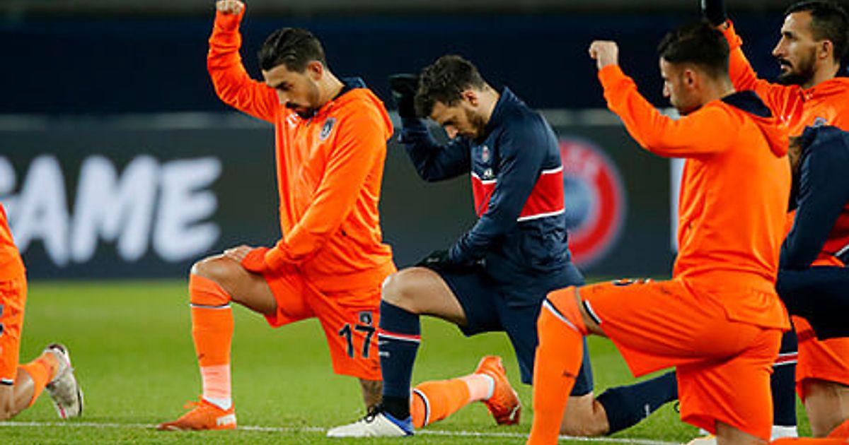 Вместо привычного прослушивания гимна Лиги чемпионов, стоя в линию, команды встали на одно колено в центре круга.