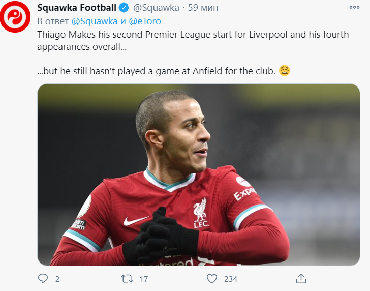 Тиаго вышел в старте «Ливерпуля» второй раз. Он до сих пор не играл на «Энфилде»