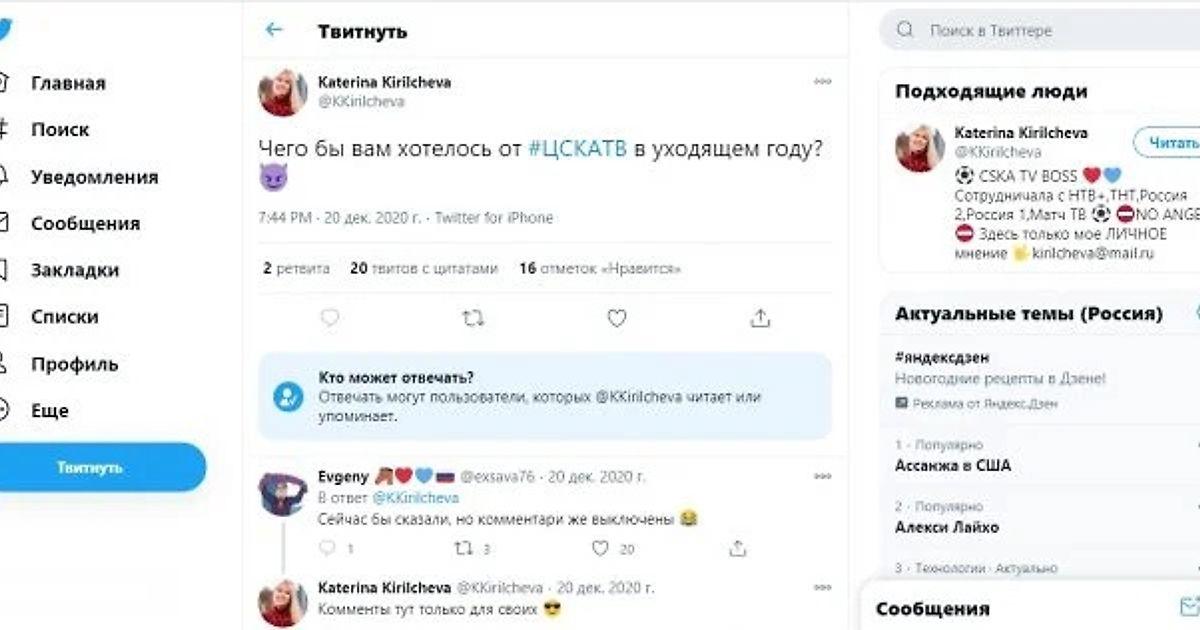 Публично отказались от фанатской критики Еще до скандала с Васиным и ВГИКом Катерина Кирильчева, главред клубного телевидения армейцев, спросила у подписчиков: «Чего бы вам хотелось от CSKA TV в уходящем году?» Это хорошая идея, ведь иногда фолловеры и зрители могут подсказать удачные идеи или форматы, до которых не дошли на мозговых штурмах в пресс-службе ЦСКА. Но Катерина ограничила реплаи в твиттере, то есть ей могли отвечать только пользователи, на которых подписана сама главред. «Сейчас бы сказали, но комментарии же выключены», – логично заметил один из прорвавшихся. «Комменты тут только для своих», – заявила Кирильчева. Она воспарила на недосягаемый уровень и, на самом деле, не хочет слушать других мнений – только лояльные подписчики. В этом треде какие-то мелкие добивки вроде внутренних шуток от других сотрудников пресс-службы и милота типа «Больше послепобедных репортажей!» Конечно, к Катерине никак не пробиться с критикой кукольного шоу. Сделали плохие пародии на советские фильмы Перед зимними праздниками на ютубе ЦСКА вышли шесть видосов, стилизованные под старые комедии. По неловким каламбурам в заголовках легко узнать, что это именно медиаслужба армейцев – «Операция такси», «Джентльмены ПФК ЦСКА», «О’Дин дома», «Операция Ы: Михалыч выбирает состав». Каждый ролик длится по 1,5 минуты, первые 20 секунд – гигантская и одинаковая заставка, в конце еще секунд 10 чья-то рука пультом выключает телевизор.