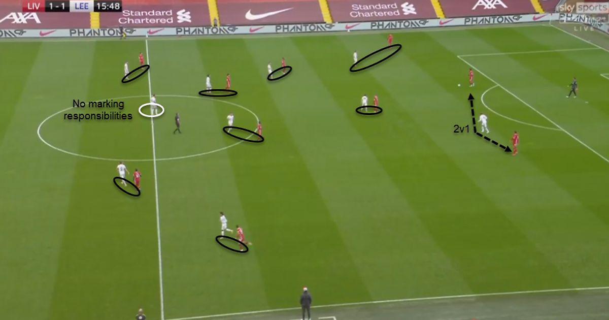 И конечно из-за такой агрессивной игры в первой фазе отбора, когда на трети поля соперника находится по 5-6 игроков Лидса, в случае переходной фазы, мы можем часто наблюдать такие моменты, когда на 4 игроков соперника приходится лишь 3 защитника Лидса, которые бегут лицом к своим воротам и просто не готовы встречать атакующую группу.