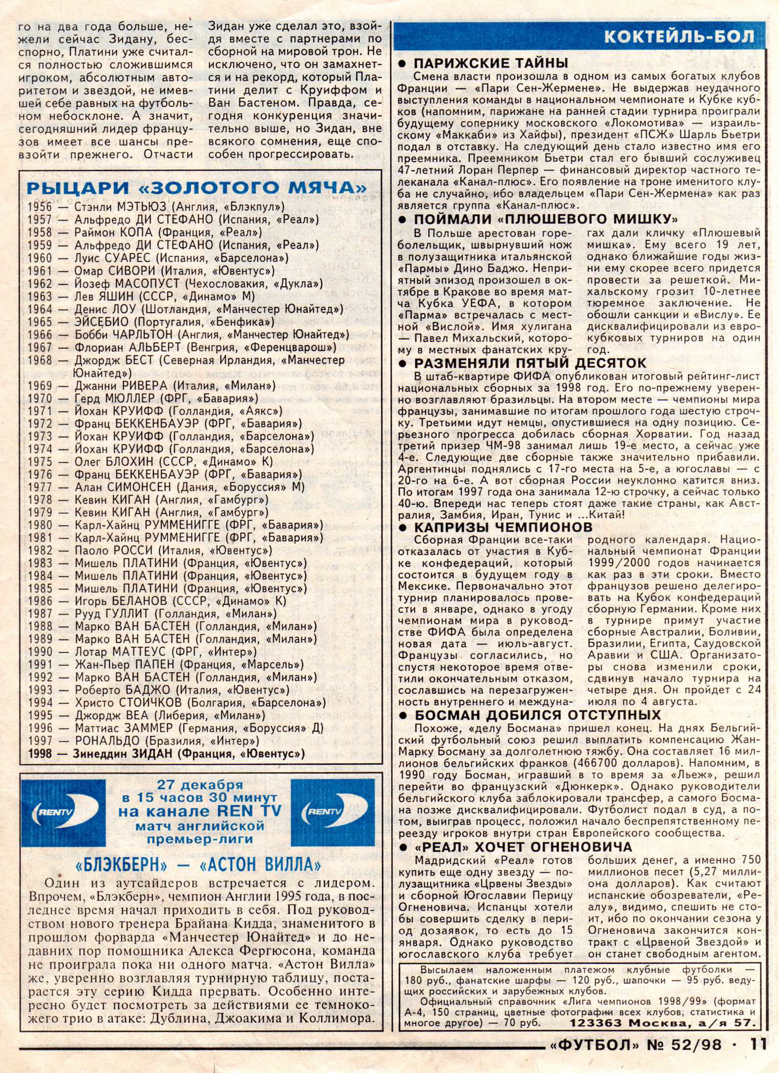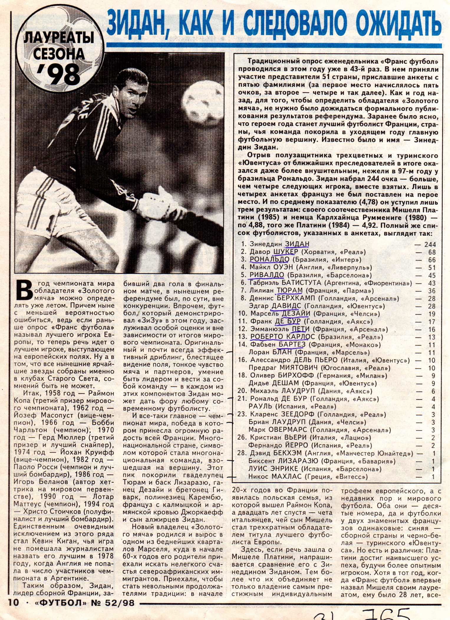 Статья о Зинедине Зидане - обладателе Золотого мяча в еженедельнике Футбол. 1998 год