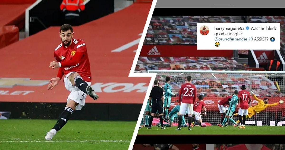 Харри Магуайр в шутку пытается записать на себя голевую передачу на победный гол Бруну Фернандеша против «Ливерпуля»