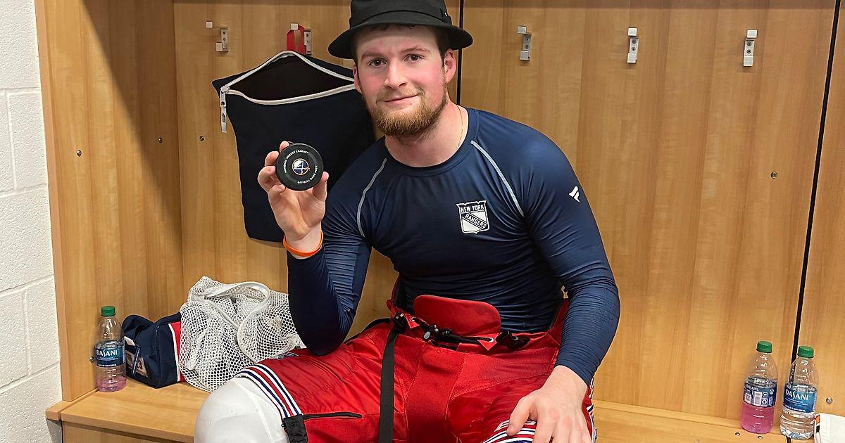 Как положено, он получил свою первую шайбу бyквально, ну и за компанию бродвейскую шляпу, как это принято в Рейнджерс для лучшего игрока в составе команды.