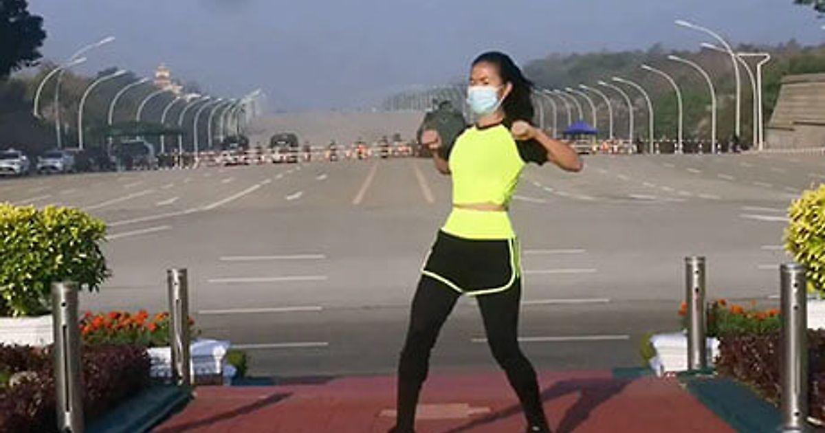 Учительница физкультуры Кхинг Хнин Вай живет в столице Мьянмы и регулярно записывает ролики по аэробике. 1 февраля она пришла на одно из постоянных мест для занятий и внезапно засняла историческое событие. В момент, когда девушка танцевала под зажигательную песню, на заднем плане к блокпосту подъехал военный конвой. Затем он благополучно направился к парламенту.