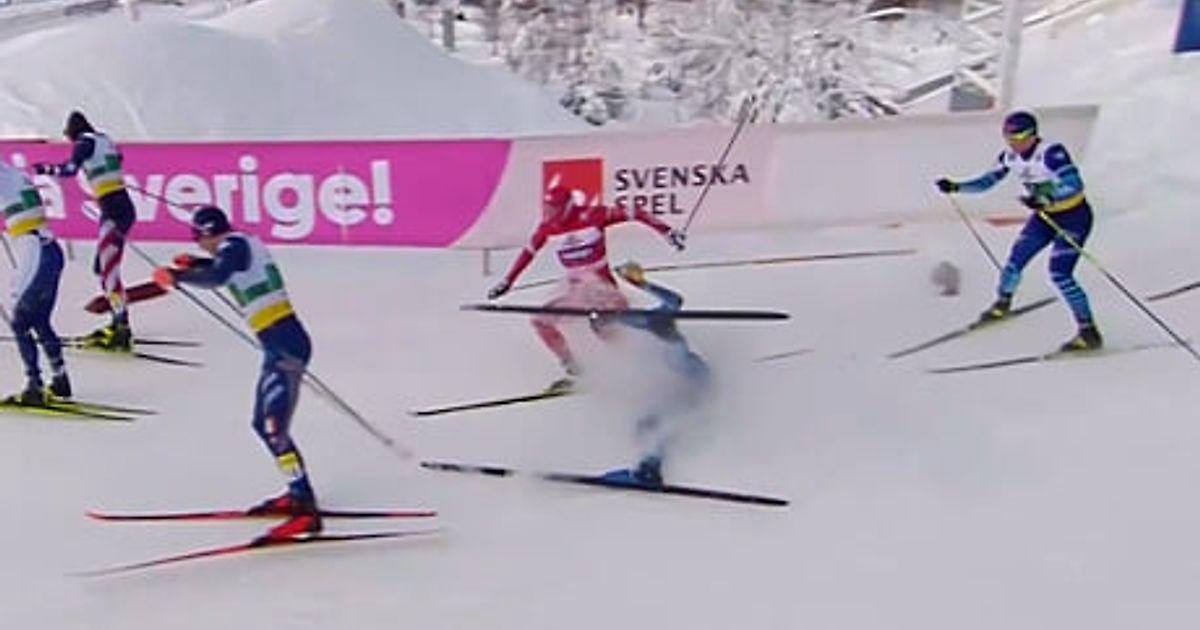 Финн Вернери Сухонен дерзко ускорился по внешнему радиусу, поскользнулся и свалился на Глеба. Тому просто некуда было увернуться – соперники спереди и сзади, а справа уже щиты. В итоге падение, и за 300-400 метров до финиша потерянное время уже не отыграть.