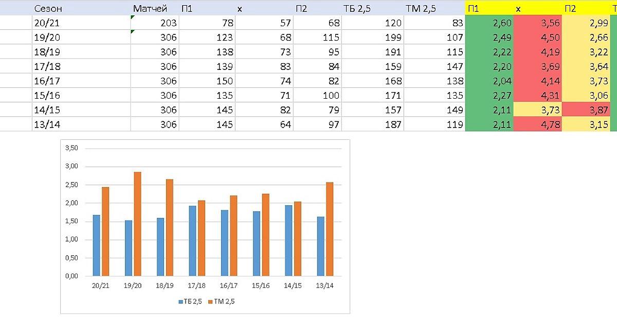 На картинке приведена статистика Бундеслиги за последние 7 сезонов + текущий сезон.Цветные ячейки показывают частоту события, т.е. через сколько матчей наступает П1/х/П2/ТБ/ТМ.Эти частоты помогают понимать периодичность наступления исходов.