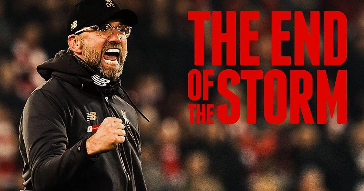 Название «Конец шторма» отсылает к строчке из «You’ll Never Walk Alone»: «At the end of the storm, There’s golden sky». Это одна из самых популярных фраз при документировании достижений «Ливерпуля». Например, так же была озаглавлена книга, посвященная другому чемпионству - сезона 1946-47. В том году до последнего тура на победу претендовали четыре команды: «Ливерпуль», МЮ, «Вулверхэмптон» и «Сток», в итоге первое и четвертое место разделили всего 2 очка. Это был первый послевоенный чемпионат (первый с 1939 года) и первый титул «Ливерпуля» с 1923 года. До 2020 – это самый длинный период клуба без чемпионства – 24 года (кстати, после 1947 года следующая победа была только через 17 лет в 1964).