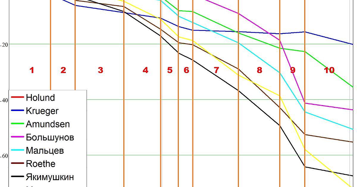 Amundsen хоть и начал быстрее первых двух, но со второго круга проигрывал все сильнее и сильнее своим соотечественникам, даже без небольшого падения, думаю, все равно бы не обогнал Krueger'а.