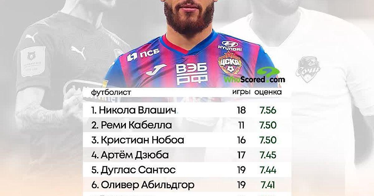 Лучшие игроки РПЛ на данный момент по средней оценки портала «Whoscored»