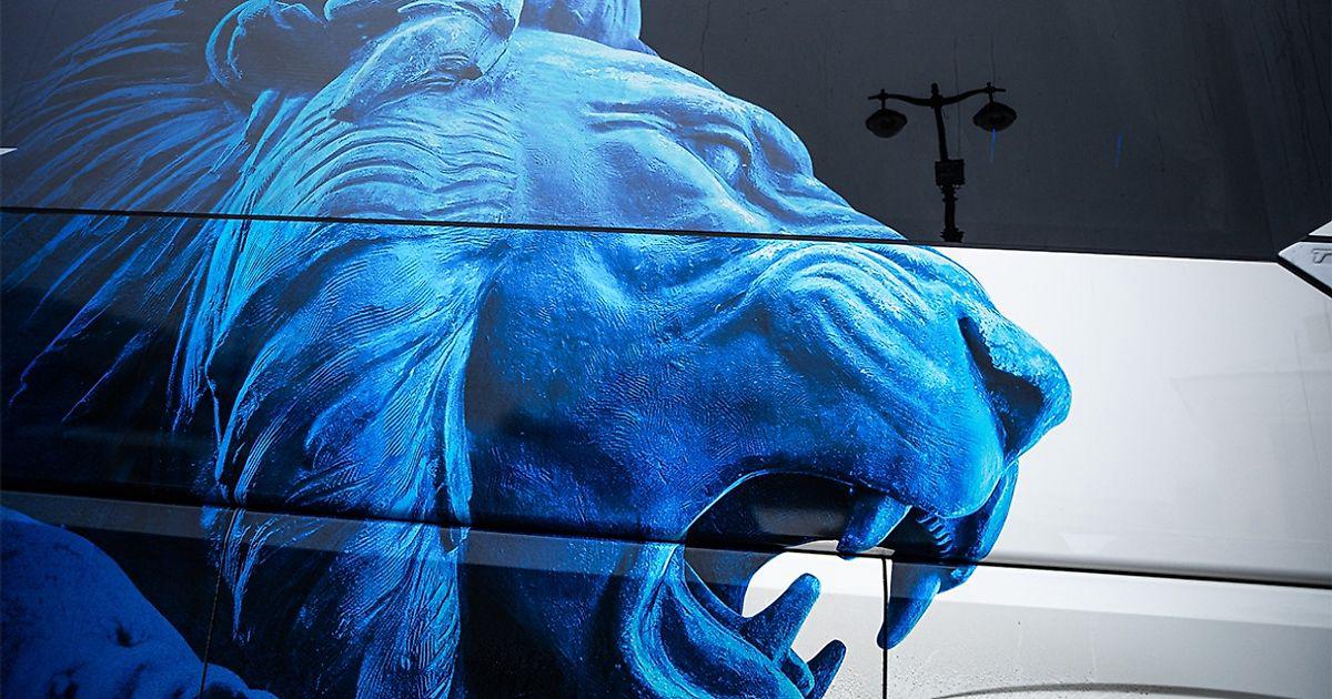 Помимо традиционной стрелки увеличенного размера, на борты автобуса нанесены изображения бронзовых львов, вдохновленные многочисленными петербургскими скульптурами и барельефами.