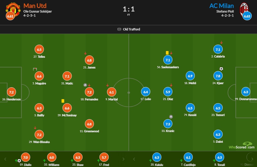 По завершению матча портал WhoScored традиционно опубликовал оценки игрокам каждой из команд и, что интересно, Амад Диалло, забивший единственный гол "Юнайтед" в матче не попал даже в тройку лучших игроков (7 баллов). Более высокие оценки у Хендерсона, Фернандеша, Уан-Биссаки (по 7,2) и Матича (7,1).