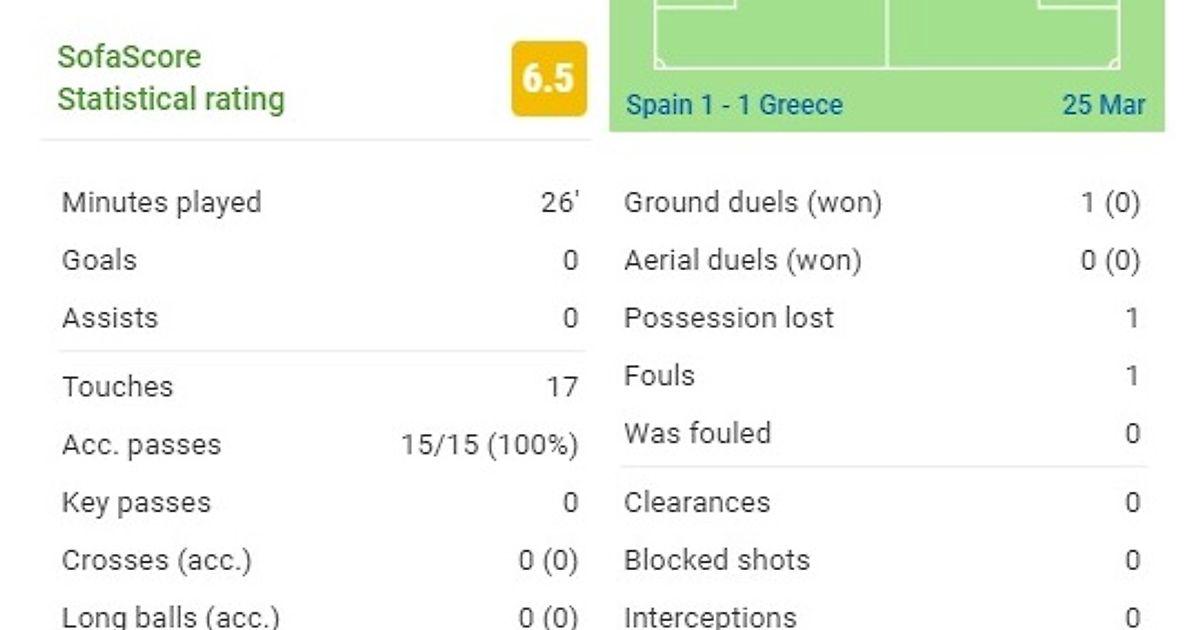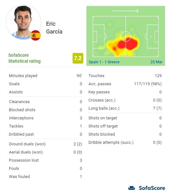 35-миллионный проект Бартомеу, Планеса и Кумана отметился 100%-ной точностью передач, при этом не имеет других полезных действий (от ключевых передач и до выигранных единоборств). Из всех находившихся на поле игроков сборной столь же слабо в поле играл лишь голкипер Унаи Симон. Впрочем, все это не приведет ни к критике его игры, ни к вопросу о том, почему он имеет безусловный статус титулара в «Барсе». С другой стороны, Эрик Гарсия провел отличный матч за сборную.