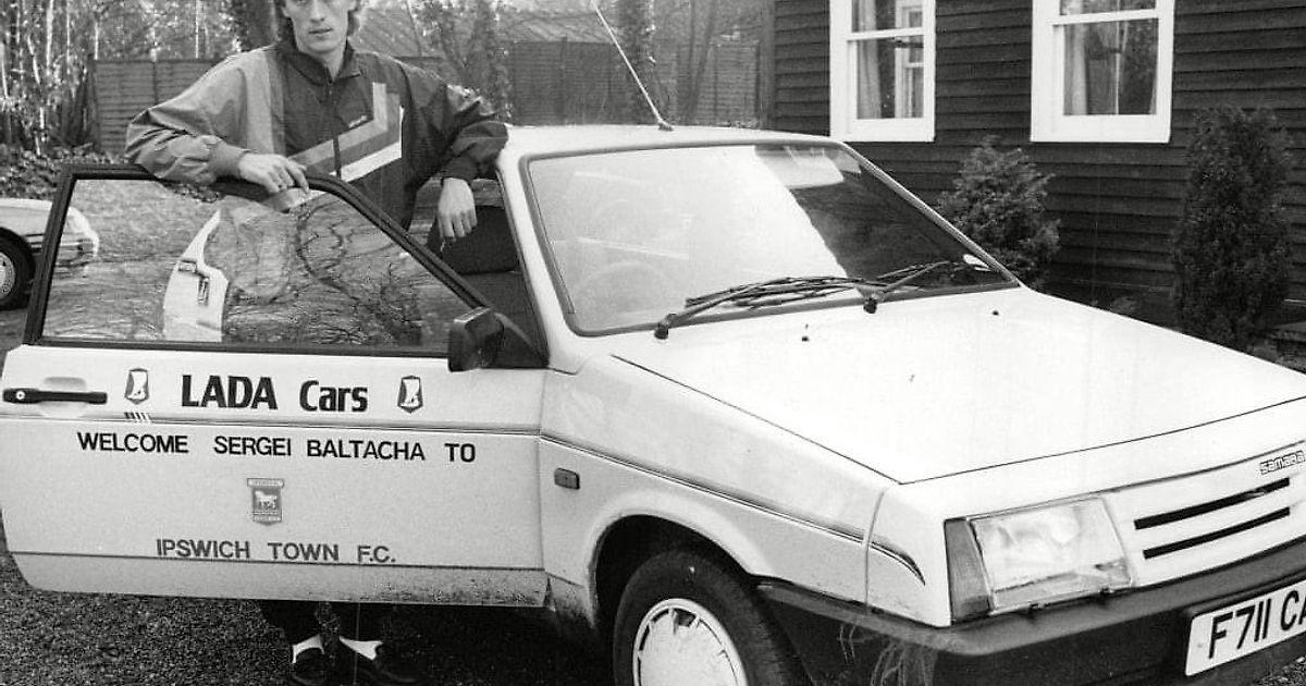 Экс-полузащитник киевского "Динамо" и новобранец "Ипсвич Таун" Сергей Балтача с подарком от руководства клуба - новенькой праворульной "восьмеркой", 1988 г.