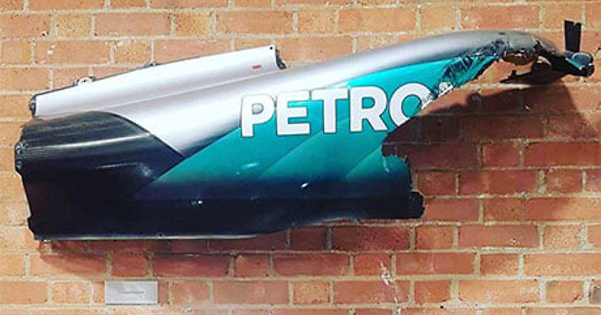 Но, как выяснилось, «Мерседес» до сих пор хранит разбитые корпуса боковых понтонов с обоих болидов – на специальной стене секретного склада.
