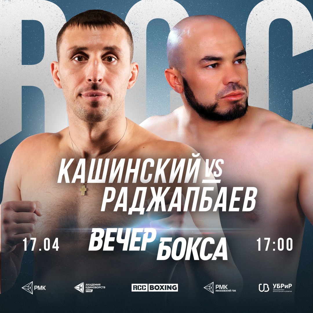 Российский боксер Юрий Кашинский (19-1, 17ко) проведет восьмираундовый поединок против Мухитдина Раджапбаева (12-8-1, 8ко) из Узбекистана. Бой пройдет в первом тяжелом весе и откроет главный кард на шоу RCC Boxing Promotions 17 апреля.