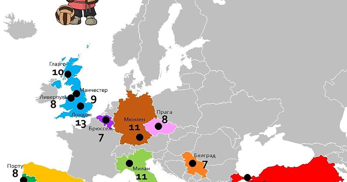 Сегодня в рубрике #Еврочашки представлена карта стран с городами, где чаще всего наши клубы играл в еврокубках. Тут, конечно, не все, а только ТОП15, где прошло 7 и более матчей, даже с учетом финалов кубков УЕФА