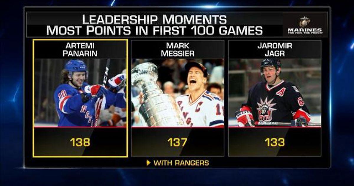 Во вторых Панарин вошел в историю Рейнджерс, как игрок, который набрал больше всего очков за команду в первые 100 игр: 138 очков, следующий вторым Марк Мессье набрал 137, тоже самое касается ассистов, у Хлеба 93 у Мессье 92.