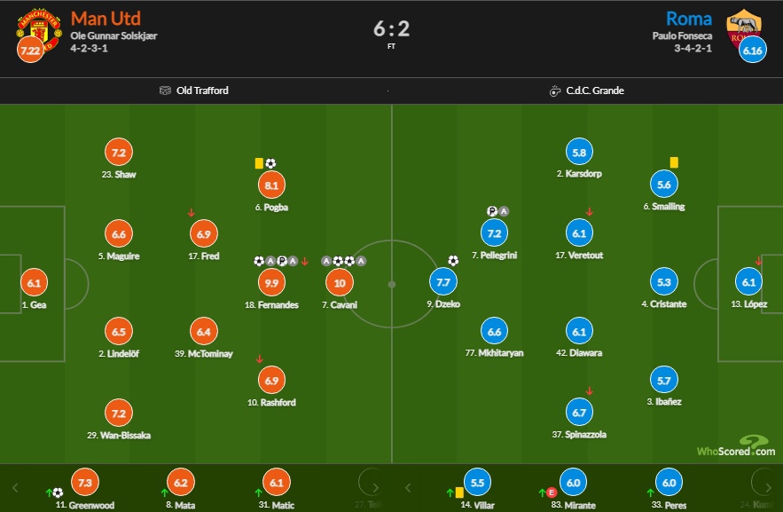 Эдинсон Кавани, чей дубль переломил ход игры, получил идеальную оценку — 10 баллов. Бруну Фернандеш, который также забил два, получил всего на одну десятую балла меньше. А вот у Поля Погба, который также отметился голом, получил гораздо меньше — всего 8,1. Как и Мэйсон Гринвуд — 7,3.