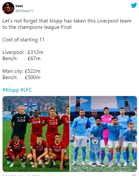 Болельщики «Ливерпуля» в Twitter проводят сравнительный анализ достижений Юргена Клоппа в клубе с прогрессом «МанСити» в Премьер Лиге и в Европе, отмечая большую разницу в финансовом положении клубов.