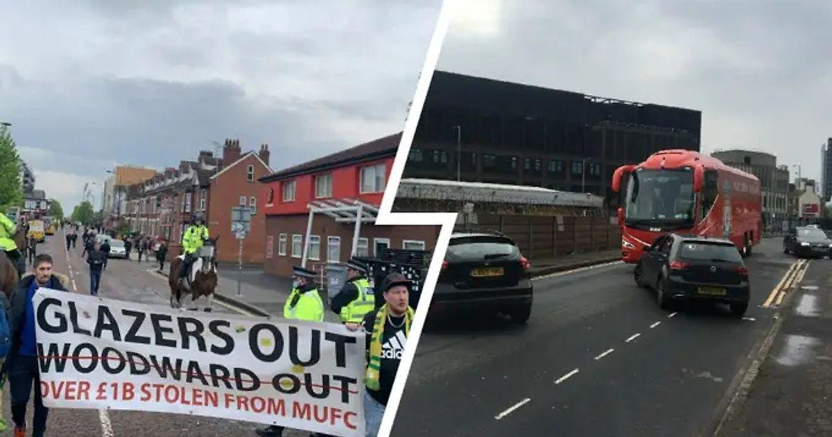 Протестующие начинают прибывать на «Олд Траффорд» в преддверии перенесенного матча, автобус «Ливерпуля» заблокирован