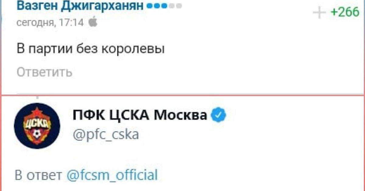 В ответ SMMщики ЦСКА написали: "Жаль, что без Королевы" (намек на уход Заремы из клуба, она хотела другого тренера).