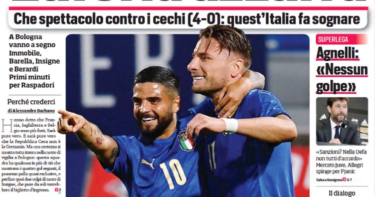 Убедительная проверка за неделю до дебютана Чемпионате Европы против Турции. Каков спектакль против чехов (4:0): эта Италия позволяет мечтать. В Болонье забили Иммобиле, Барелла, Инсинье и Берарди. Первые минуты для Распадори.
