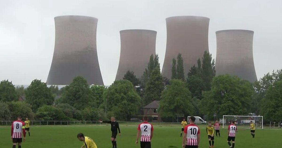 Football match interrupted by power station demolition. A football game taking place in Rugeley, Staffordshire, was interrupted by the controlled demolition of 4 chimneys at a power station in the town. The cooling towers were brought down at 11.15am today (June 6). #rugeley pic.twitter.com/rl3NzEMK0C