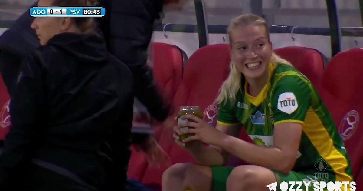 В финале кубка Нидерландов по футболу среди женских команд между "ПСВ" и "Ден Хааг" одна из футболисток решила восстановиться... огуречным рассолом! Говорят, отличная альтернатива изотоникам. Героиню эпизода зовут Джаннетт Ван Белен.