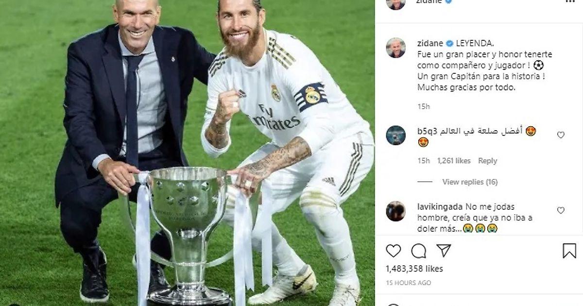 «Легенда. Для меня было большим удовольствием и честью видеть тебя в качестве товарища по команде и как моего игрока», - говорится в сообщении Зинедина Зидана в Instagram Серхио Рамосу.
