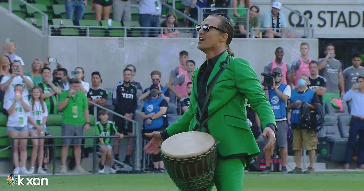 Стук в барабан и зеленый наряд – посмотрите, как Мэттью Макконахи заводил фанатов «Остина» перед первым домашним матчем сезона