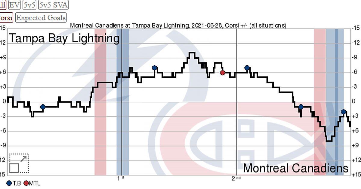 Тампа играла первым номером в первые два периода. В третьем откатилась, имея преимущество в счёте. Монреалю, естественно, приходилось наращивать активность в попытках отыграться (отмечено красным 1).