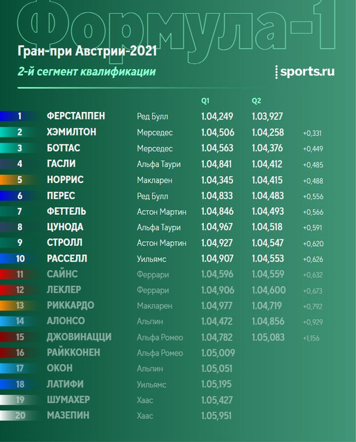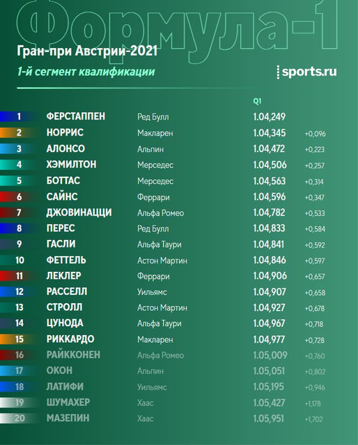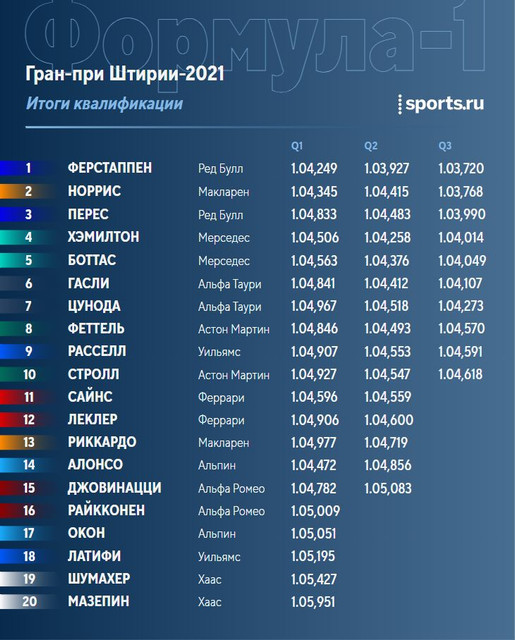 Окончательные итоги. Поул Ферстаппена угадывался, а вот внезапно реактивный Норрис – явно нет! Выдающееся выступление Ландо – до сенсационного поула не хватило совсем чуть-чуть. А вот «Мерседесы» провалились: 4 и 5 место Хэмилтона и Боттаса – явно не тот результат, на который рассчитывали в команде.