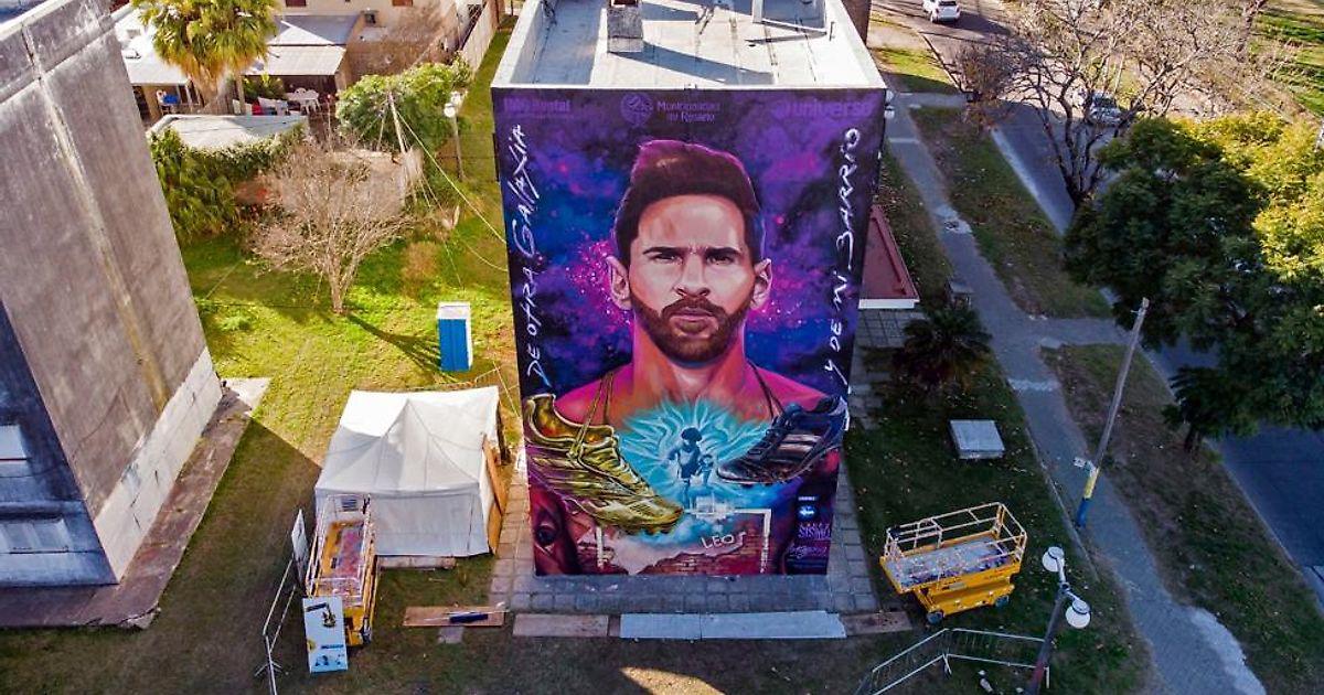 Пока будущее Лео Месси в «Барселоне» остается неопределенным, в родном Росарио в Аргентине футболисту сделали приятный сюрприз: огромное изображение на стене в знак благодарности и любви. «Из другой галактик и из моего района» - гласит надпись на граффити.