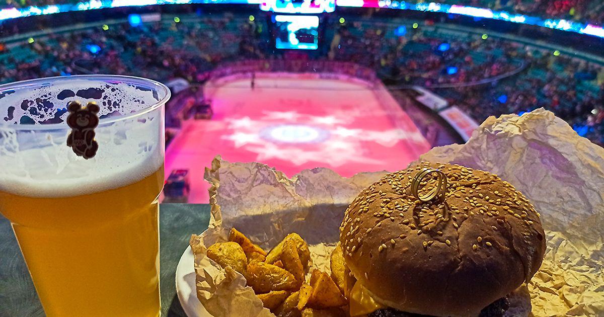 В Ледовый дворец СКА в Санкт-Петербурге я ходил до этого пару раз и все время мое внимание привлекала вывеска ОЛИМП над одной из заворотных трибун. Позже узнал, что это ресторан, в котором можно забронировать столик и наслаждаться хоккеем за приемом пищи. Желая разнообразить свой граундхоппинг, я решил сходить туда разок. Было это уже давненько, четыре месяца прошло, но написать руки дошли только сейчас.