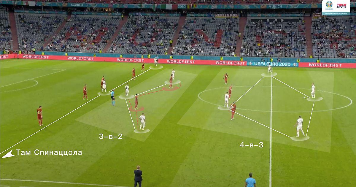 Идея Манчини заключалась в заполнении и перегрузе свободной зоны, в которую не садится Лукаку (выше отмечено, почему именно). После было несколько вариантов развития событий: короткий розыгрыш внутри образовавшегося в зоне треугольника/ромба с проникновением в штрафную, вывод на ударную позицию Инсинье (уже много раз отмечались его фирменные удары из этой зоны, второй гол – ярчайший пример) или переводы на вбегающего в штрафную на дальнем фланге Кьезу.