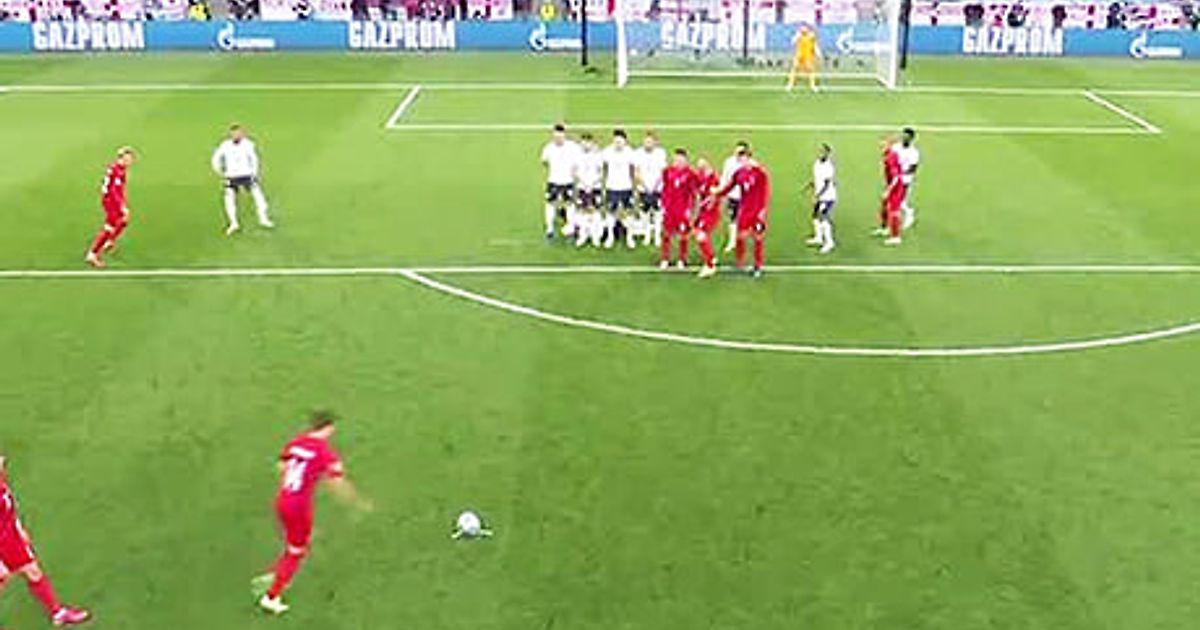 Гол Дании – это не только техничный удар Дамсгора, но и хитрость его партнеров, которые выстроили стенку из трех человек.