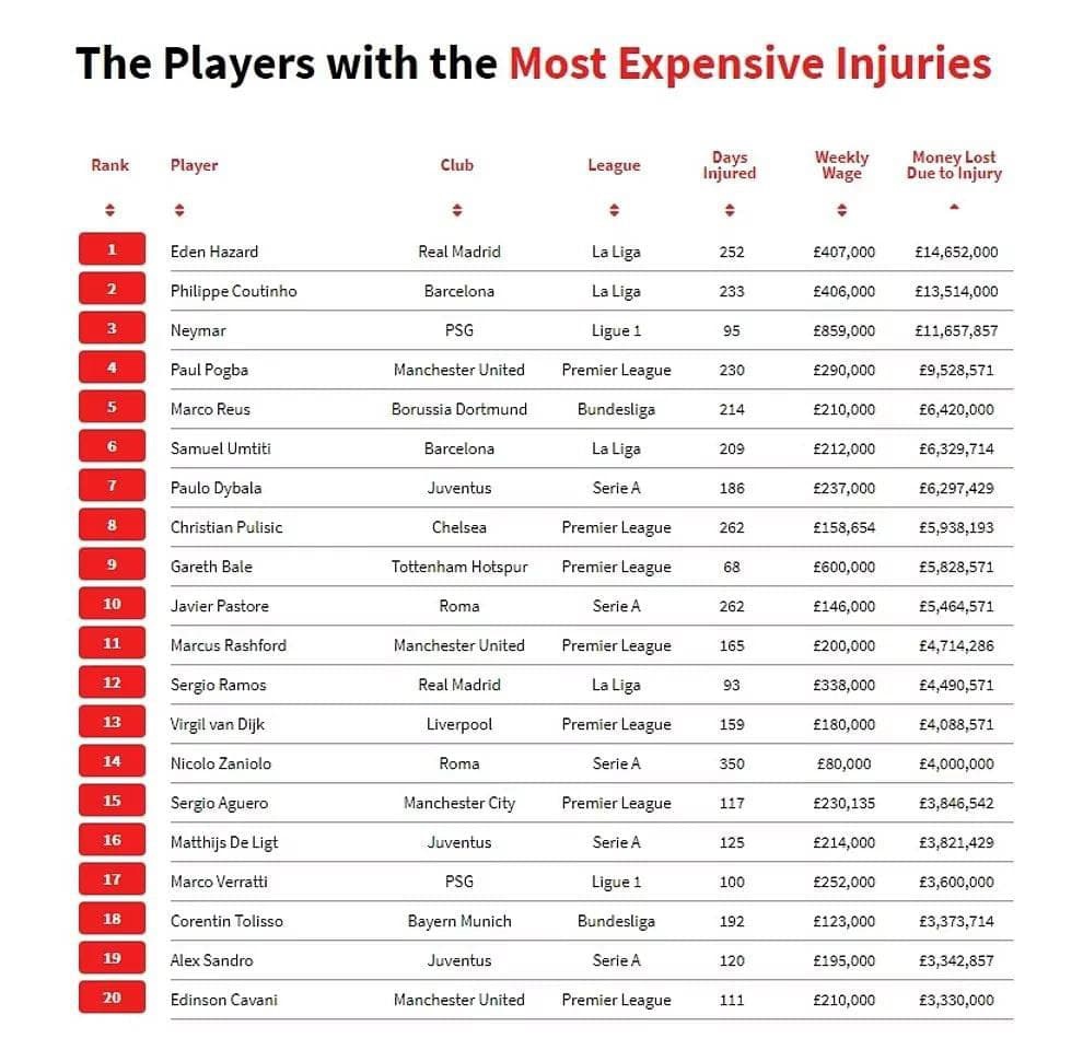 Сэм Умтити расположился на шестой строчке — 6 миллионов 329 тысяч фунтов. Полностью список самых дорогих травматичных игроков выглядит следующим образом.