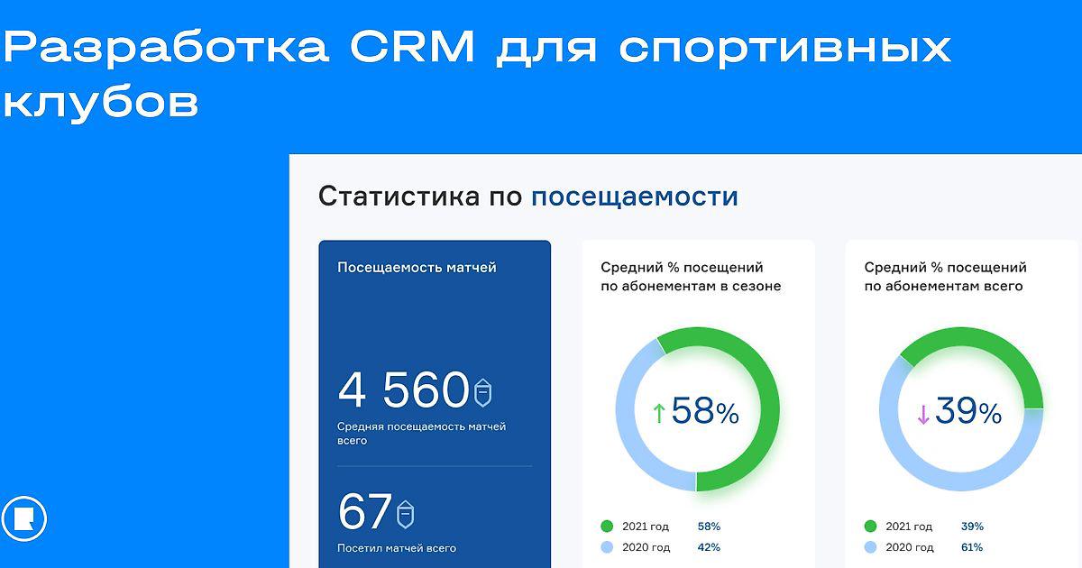 Кроме сайтов и приложений, мы разрабатываем CRM-системы для спортивных клубов. Это удобно организованные массивы данных, которые обрабатываются и хранятся в единой системе. Данные компонуются в интерактивные отчёты в заранее заданном виде. Статистика по билетам. По растущему или падающему графику сразу видно, насколько популярны матчи в сезоне, как эффективно работают менеджеры. Отдельными карточками выделены основные показатели: количество проданных билетов в сезоне и всего, средний чек, сколько людей пришло на матчи.