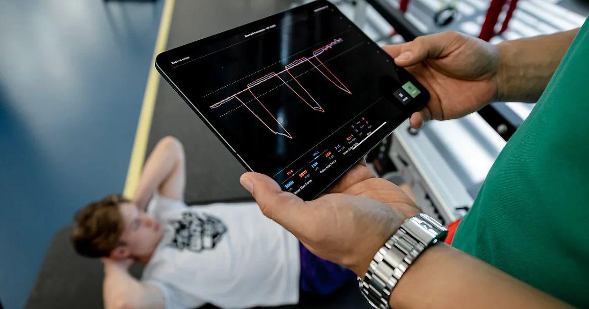 ForceFrame – это модульная портативная система для измерения силы и дисбаланса в различных мышечных группах. Для хоккеистов особенно важна правильная работа мышц бедер и таза. На фото участник программы проходит измерение силы приводящих и отводящих мышц бедра. Тензометрические датчики измеряют пиковые показатели силы в ньютонах для каждой ноги. Их можно увидеть на планшете в реальном времени. На графике отображается изменение силы во времени. Совпадение графиков для правой и левой ноги говорит о правильной и сбалансированной работе мышц бедра спортсмена.