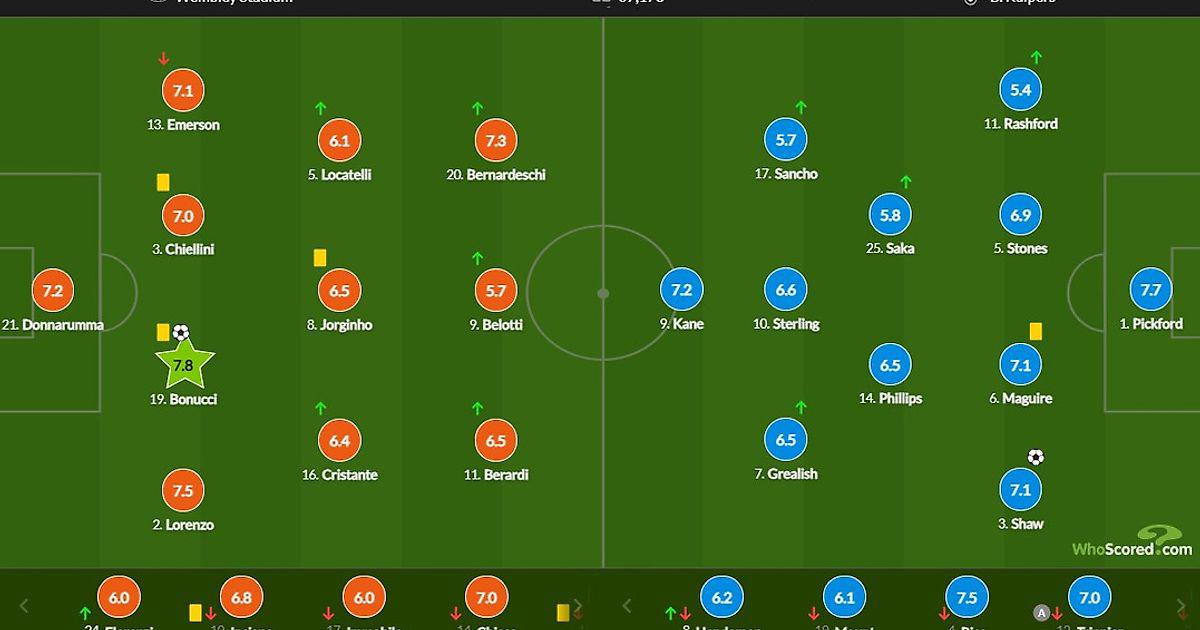 Худший - Рэшфорд (5,4). Правда, не совсем понятно, почему Санчо, который также вышел под серию пенальти, и не забил, получил рейтинг 5,7. Вероятно, из-за того, что при пробитии пенальти просто попал в створ ворот или что? В целом, у Саутгейта совсем не пошли замены: помимо вышеуказанных лиц, просто числился на поле Хендерсон (6,2), который удостоился обратной замены, а Сака за 50 минут игрового времени набрал аж 5,8/10. Не сказать, что замены Манчини прямо что-то особое дали, но многие вошли в игру вполне нормально, а Бернардески вообще на ура (7,3), и пенальти он свой реализовал. Единственно, что Белотти оказался ни о чём (5,7). Кто его пустил бить пенальти? Сразу же было понятно, что это Мората 2.0, причём Альваро явно получше будет. Также вопрос, как так вышло, что Сака был 5-м бьющим у Англии? У паренька тихий ужас на лице читался весь финал.