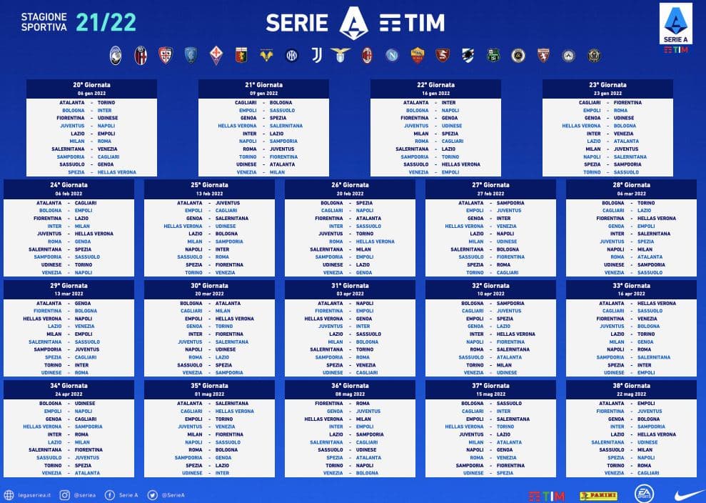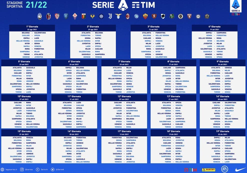Только что состоялась жеребьевка календаря нового сезона Серии А! Чемпионат начнется 22 августа, а закончится 22 мая 2022 года.