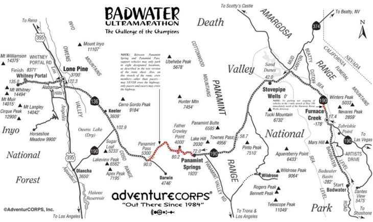 Ультрамарафон «Бэдуотер», старт которого намечен на 19 июля, организаторы называют «самым сложным забегом в мире», и на то есть все основания: дистанция 217 километров, старт из впадины (86 метров ниже уровня моря) и финиш на склоне горы Уитни (2548 метров); а проводится забег в середине июля, когда в Долину Смерти приходят экстремальные температуры – до 54 °С.