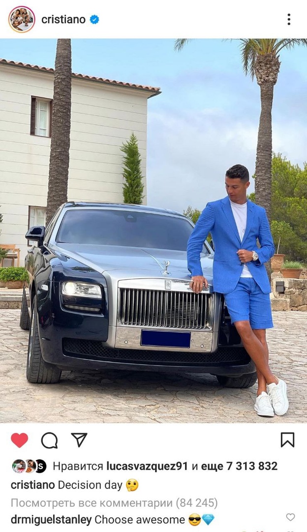 Криштиану Роналду опубликовал в своем Instagram фото, подписав его «День принятия решения». Криштиану позирует в синем костюме с шортами около своего Rolls Royce. О какие решениях размышляет португалец? Под фото уже 85 000 комментариев.