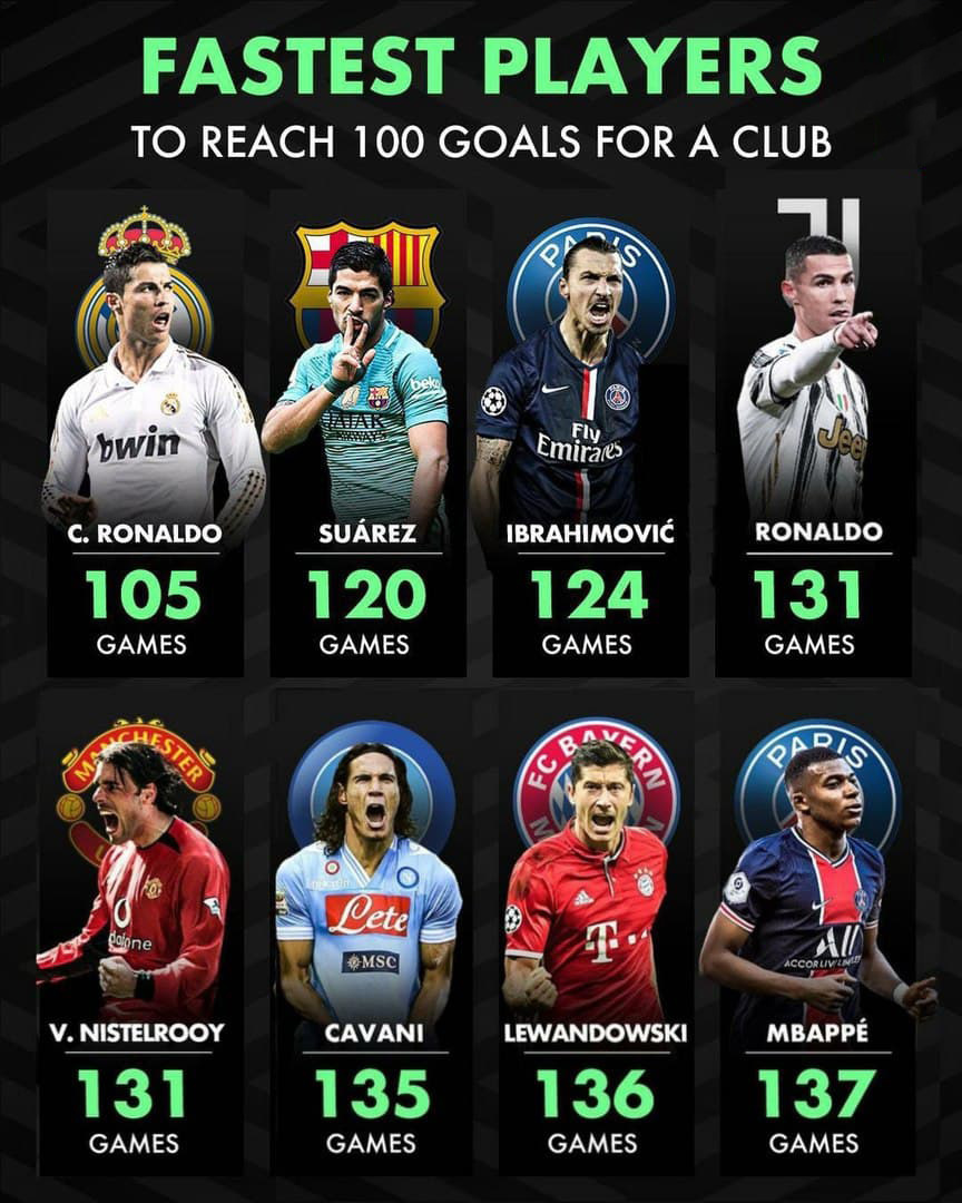 Футболисты, которым понадобилось наименьшее количество матчей, чтобы забить 💯 голов за клуб