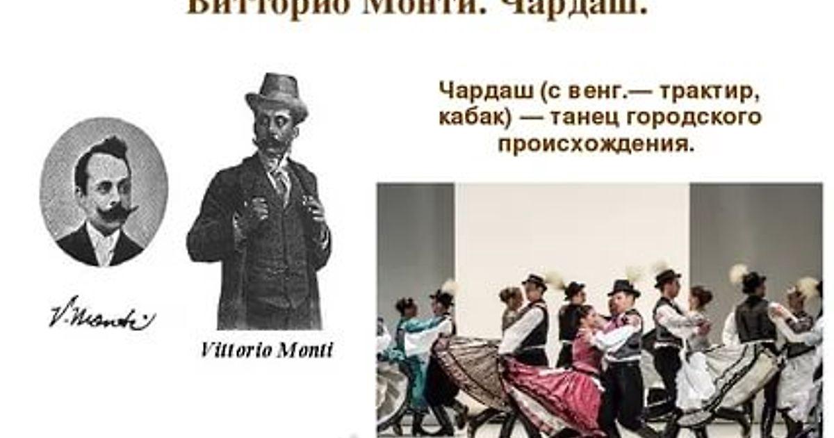 Витторио Монти (Vittorio Monti, 1868 - 1922) — итальянский скрипач, мандолинист (автор книги-метода по мандолине), композитор и дирижёр. Его самая популярная работа — Чардаш (Csárdás, традиционный венгерский танец), сочинённый около 1904 года и постоянно исполняемый разнообразными коллективами, считающийся "цыганским" репертуаром.