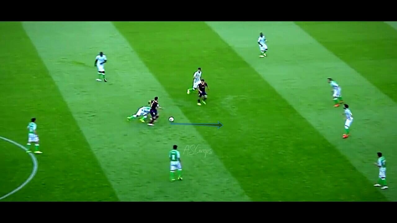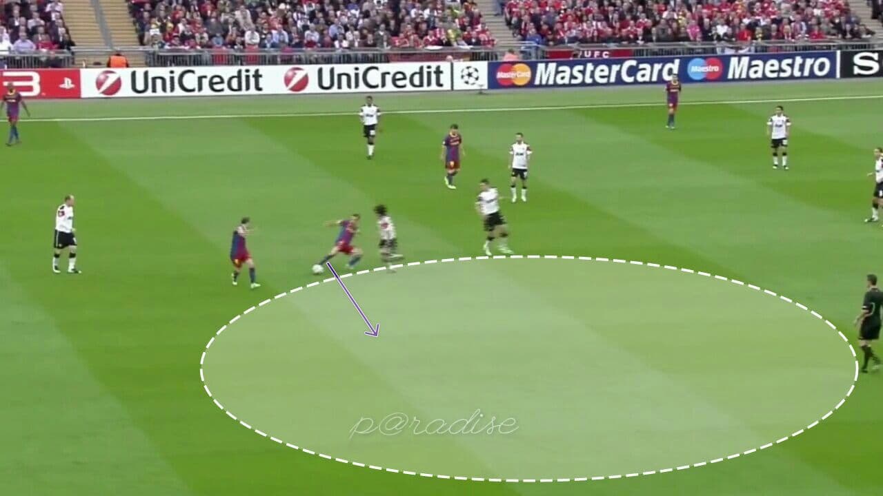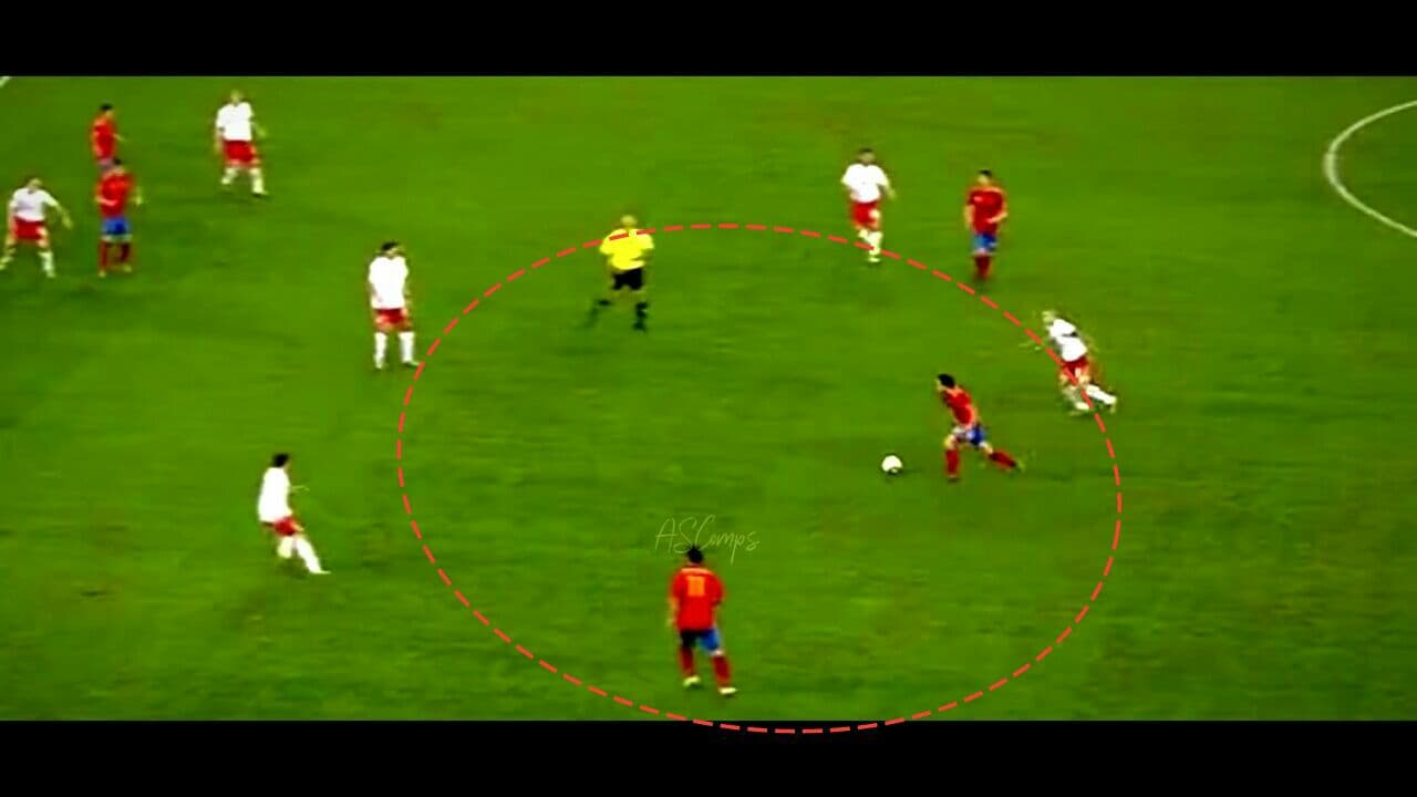 Хави уходит от соперника одним движением. Здесь было важно сделать это первое касание вовремя, иначе не получилось бы обыграть.