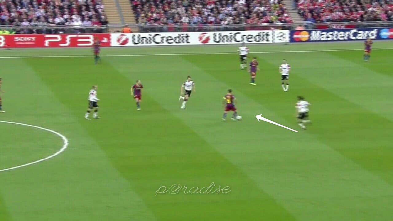 На Хави выдвигается левый полузащитник МЮ. Хави удерживает мяч(удержание-пауза) и ждёт забегания на оставленную игроком МЮ пространство.