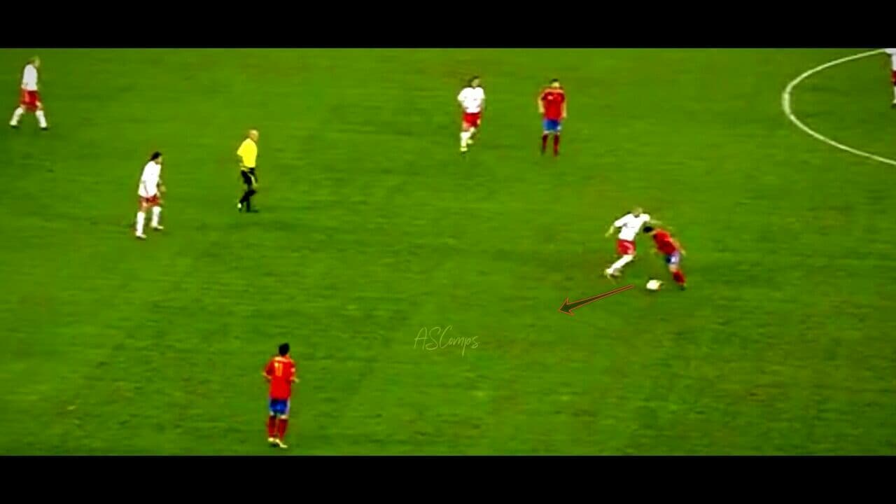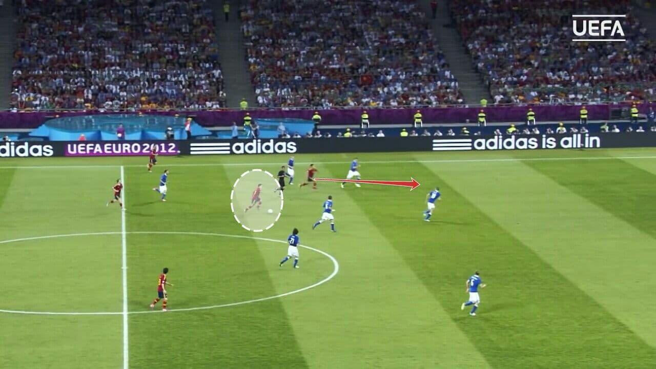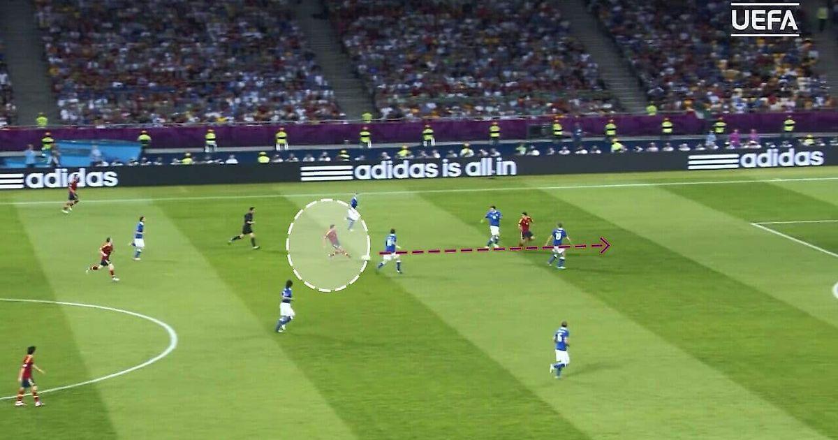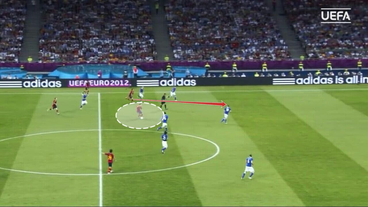 Наверное, все помнят. Мяч у Хави. Многие игроки предпочли бы пасовать назад в такой ситуации(даже ближний к нам игрок Испании показывает-сыграй назад). Но Хави удерживает мяч(пауза) и ждёт Альбу, который набирает скорость.