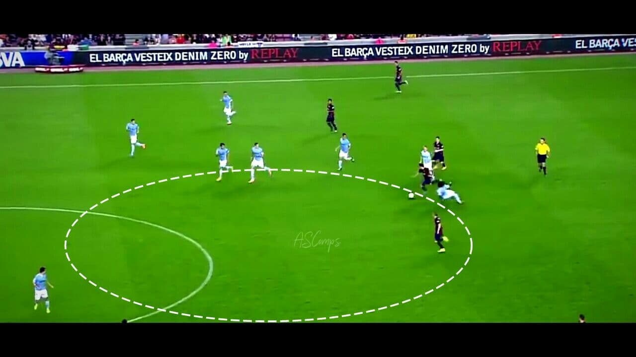 На Хави идёт соперник. Хави принимает мяч. Делает паузу(ждёт выдвижения соперника) и ...