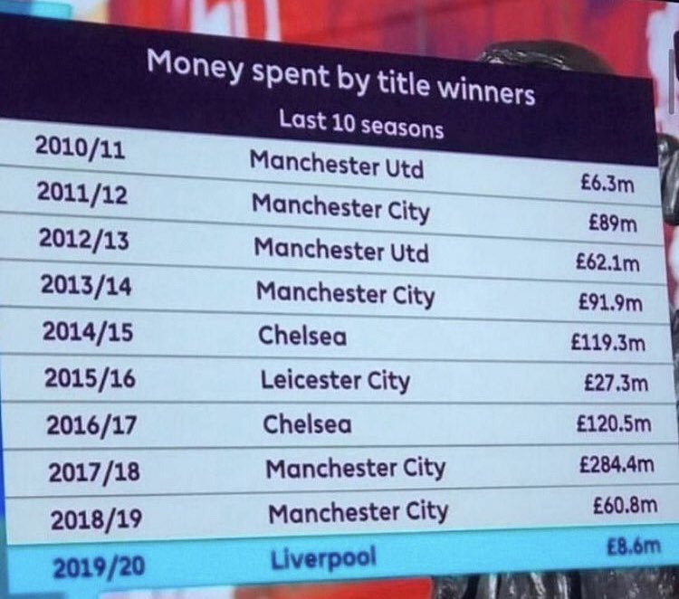 Обладая огромным преимуществом перед большинством команд Премьер-лиги в списке, «Ливерпуль» является клубом с наименьшими затратами денег среди победителей Премьер-лиги за последние 10 лет.